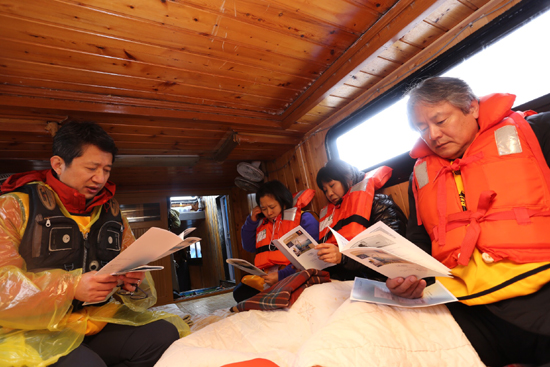 | ▲지난 4월 3일 팽목항에서 출발하여 이동 중인 선상에서 대한성공회 유시경 신부가 묵상 기도회를 인도하고 있는 장면. ⓒ베리타스 DB |