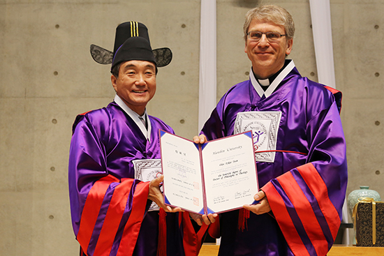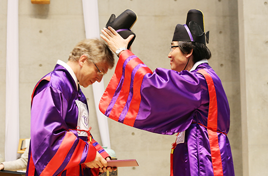 | ▲한신대가 8일(수) 울라프 트베이트 WCC 총무에게 명예 신학박사 학위를 수여한 가운데 연규홍 대학원장(오른쪽)이 트베이트 총무에게 감투를 씌워주고 있다. ⓒ사진=지유석 기자 |