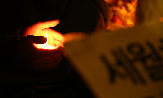 비가 부슬부슬 내리던 4월14일(화) 오후 서울 광화문 광장에서는 ‘시행령안 폐기 / 선체인양 / 배·보상 일정 중단을 위한 기독인 연합예배’가 열렸다. 이날 예배에 참가한 기독인들은 촛불을 밝히고 세월호 진상규명을 위해 간절히 기도했다.