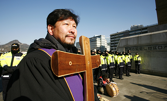 | ▲민주노총 금속노조 소속 기륭전자분회 조합원들이 지난해 12월 26일(금) 오전 서울 광화문 광장을 출발해 청와대로 행진하려다 경찰에 저지당했다. 이날 조합원들의 행진에는 이윤상 전주경동교회 목사(기장)가 십자가를 들고 함께 했다. ⓒ사진= 지유석 기자 |