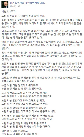 김동호 목사는 1주기 하루 전인 15일(수) 오후 자신의 페이스북에 세월호 추모의 의미를 담은 노란 리본을 주제로 글을 올렸다. 김 목사는 노란 리본을 단 정치인들을 향해 “정치인들이라고 다 진심이 아닌 것은 아니겠지만 진실성은 없어 보인다. 사람에게 보이려고 길거리에 서서 기도하던 바리새인 같은 느낌이 든다”고 적었다. 그러면서 “내게도 그런 마음이 있다는 걸 내가 안다. 그래서 나는 선뜻 노란 리본을 달지 못하고 있다. 그런 마음을 가지고 리본을 다는 건 비겁한 거라는 생각이 들어 나는 쉽게 리본을 달지 못하고 있다”는 심경을 밝혔다.