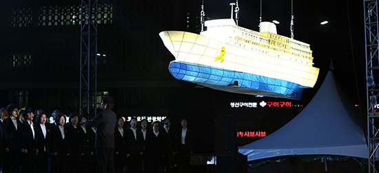 | ▲16일(목) 오후 서울 시청광장에서 세월호 추모 문화제 “4.16 약속의 밤” 행사에서 진행된 세월호 인양 퍼포먼스. ⓒ사진=지유석 기자 |