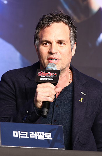올해 첫 블록버스터 <어벤져스 : 에이지 오브 울트론> 개봉을 앞두고 조스 웨던 감독, 로버트 다우니 주니어(아이언맨), 크리스 에반스(캡틴 아메리카), 마크 러팔로(헐크) 등이 방한해 17일(목) 기자회견을 가졌다. 이들은 세월호 참사 1주기임을 감안, 옷깃에 세월호를 추모하는 노란 리본을 달고 회견에 임했다.