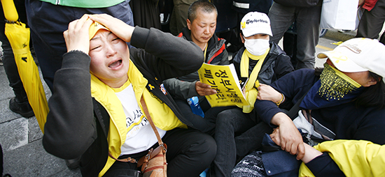 단원고 ‘예은이 엄마’ 박은희 씨. 박 씨는 경찰이 체포조를 투입하려 하자 온 몸으로 방패를 막아섰다. 이러자 다른 유가족들이 나서 인간 사슬을 만들었다.