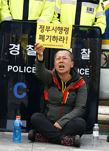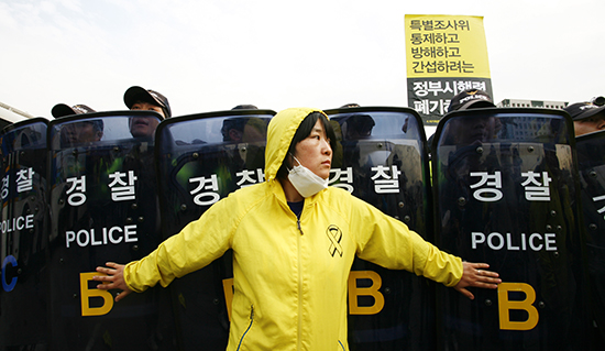 ‘영석 엄마’ 권미화 씨. 권 씨는 도로에 주저앉아 ‘정부시행령을 폐기하라’고 적힌 손팻말을 들고 “진상규명”과 “시행령 폐기”를 목청껏 외쳤다. 방패로 무장한 경찰이 체포를 시도하자 “이런 식으로 경찰이 대응했다면 우리 아이들 다 살아 돌아왔다”고 경찰을 향해 호통을 쳤다.