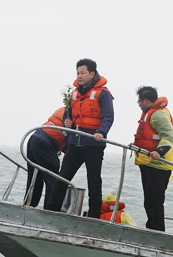 | ▲성금요일이던 지난 4월3일(금) 이윤상 목사는 세월호 침몰 지점을 찾아 헌화했다. ⓒ사진=지유석 기자 |