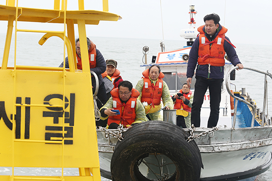 | ▲성금요일이던 지난 4월3일(금) 이윤상 목사(사진 오른쪽 첫번째)는 세월호 침몰 지점을 찾아 헌화했다. ⓒ사진=지유석 기자 |