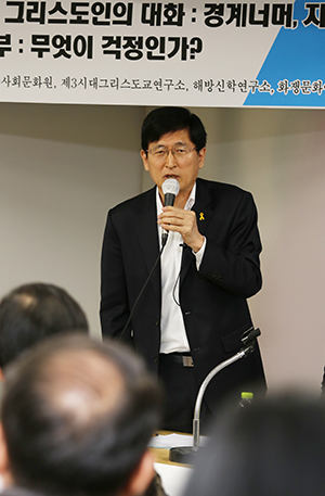 | ▲김근수 해방신학연구소 소장은 25일(토) 오전 서울 종로구 사간동 화쟁문화아카데미에서 열린 2015종교포럼 <종교를 걱정하는 불교도와 그리스도인의 대화: 경계너머, 지금여기>에서 “가난한 사람에게 봉사하는 것이 진짜 권위”라고 강조했다. ⓒ사진=지유석 기자 |