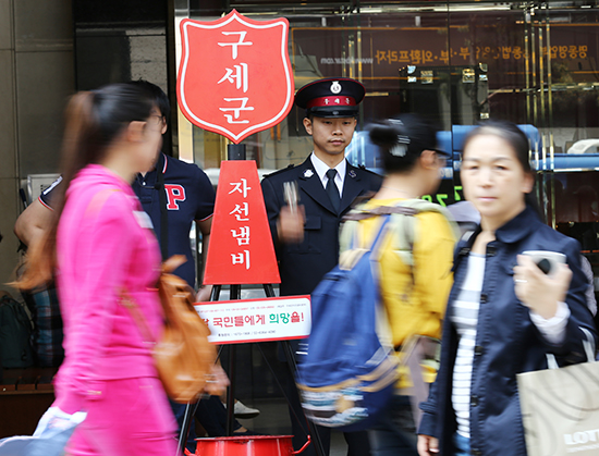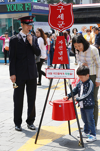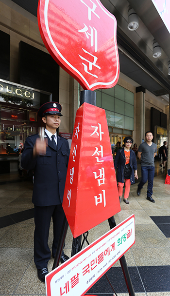 | ▲지난 4월25일(토) 네팔에서 규모 7.9의 강진이 발생해 5,000명이 넘는 사망자가 발생한 가운데 한국구세군(사령관 박종덕)은 5월1일(금) 오전 서울 명동, 서울역 등 서울 시내 20여 곳에서 자선냄비 거리모금 활동에 나섰다. ⓒ사진=지유석 기자 |