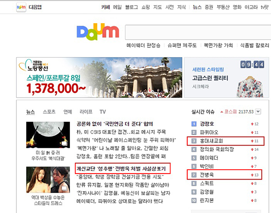 | ▲5월 4일 검색 포탈 사이트 다음(DAUM) 등에서는 예장합동 총회가 삼일교회가 제기한 전병욱 목사 면직상소를 반려한 소식이 전해지자 여론이 들끓었다. ⓒ‘다음’ 초기화면 갈무리 |