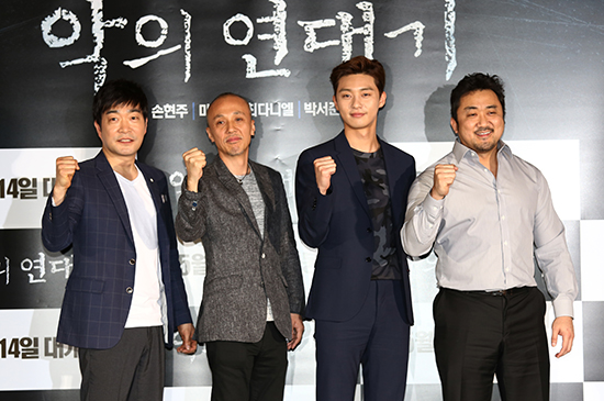 | ▲2015년 첫 스릴려 <악의 연대기> 시사회 및 기자간담회가 6일(수) 왕십리 CGV에서 열린 가운데 출연배우들이 포즈를 취하고 있다.(왼쪽부터 손현주, 백운학 감독, 박서준, 마동석) ⓒ사진=지유석 기자 |