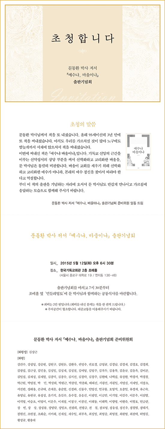 문동환 박사의 『예수냐, 바울이냐』 출판기념회가 12일 오후 6시 30분 기독교회관 2층 조에홀에서 열린다. 문 박사는 이 책을 통해 기독교 신앙의 근간을 이루는 신약성서의 상당 부분을 써서 신학화하고 교리화한 바울을 통렬히 비판한다. 바울이 교회를 세우기 위해 신학화하고 교리화한 예수가 아니라, 본래의 예수 정신을 찾아서 따라야 한다고 역설한다. 문 박사는 이날 기념회에 참석해 응답의 순서를 맡는다.