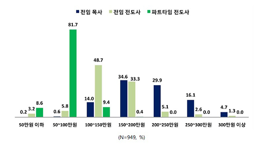 | ▲기윤실이 부교역자 949명을 대상으로 설문조사를 실시한 결과 월 평균사례비가 전임목사(515명)는 204만원, 전임 전도사(156명)는 148만원, 파트타임 전도사(278명)는 78만원으로 나타났다. |