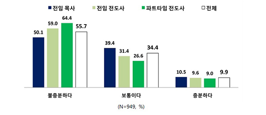 | ▲기윤실이 부교역자 949명을 대상으로 설문조사를 실시한 결과 현재 사례비에 대해 ‘충분하다’는 긍정응답은 9.9%로 ‘불충분하다’는 부정응답 55.7%보다 45.8%p 낮게 조사됐다. 응답자 특성별로는 ‘부교역자의 연령이 높을수록,’ ‘파트타임 전도사일수록,’ ‘교회규모가 작을수록’ 불충분하다는 응답이 높았다. |