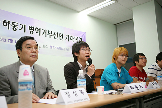 | ▲지난 2009년 서울 연지동 기독교회관에서 열린 '기독교신자 하동기씨 양심에 따른 병역거부선언 기자회견'에서 당시 연세대 신학과에 재학 중인 하동기씨가 병역거부 선언을 하고 있는 모습. 하씨 오른쪽은 연세대 신과대 학생들. 상기 사진은 위 기사와 직접적으로는 관련이 없습니다. ⓒ베리타스 DB |
