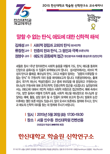 한신대학교 학술원 신학연구소(소장 김재성 교수)는 5월26일(화) 오후 5시30분부터 서울 인수동 한신대학원 컨벤션홀에서 교수세미나 “말할 수 없는 탄식, 애도에 대한 신학적 해석”을 개최한다. 이 날 김재성 교수는 “사회적 결핍과 교회의 탄식”을, 류장현 교수는 “민중의 한과 탄식, 그 원인과 극복”을, 권명수 교수는 “애도의 공동체적 접근: 정신분석과 의례를 중심으로”를 발제한다.