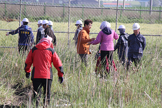| ▲18일(월) ‘군산새만금 354kV 송전선로’ 변경을 둘러싸고 지역주민과 한국전력 직원들 사이에 실랑이가 오가고 있다. 지역주민들은 한전이 기습적으로 공사를 강행했다며 강력히 비난했다. ⓒ사진제공= 새만금송전철탑반대공동대책위원회 |