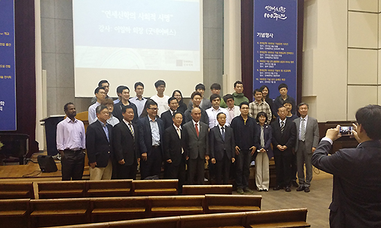 | ▲지난 19일(화) 이일하(신학 65) 굿네이버스 회장이 “연세신학의 사회적 사명”이라는 주제로 강연을 진행한 후 참석한 관계자들과 함께 기념촬영을 하고 있다. ⓒ사진=최웅재 객원기자 |