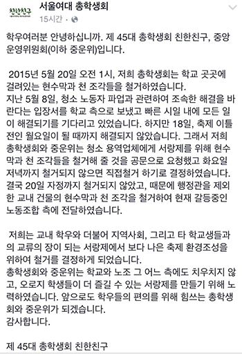 총학과 중운위는 현수막 철거를 결정하면서 “학교와 노조 그 어느 측에도 치우치지 않고, 오로지 학생들이 더 즐길 수 있는 서랑제를 만들기 위해 노력했다”고 덧붙였다.