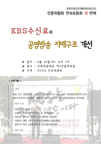 한국기독교교회협의회(NCCK) 언론위원회(위원장 전병금 목사)는 세 번째 연속토론회를 5월28일(목) 오후2시 국회의원회관 제2간담회의실에서 개최한다. 주제는 “KBS 수신료와 공영방송 지배구조 개선”이다.