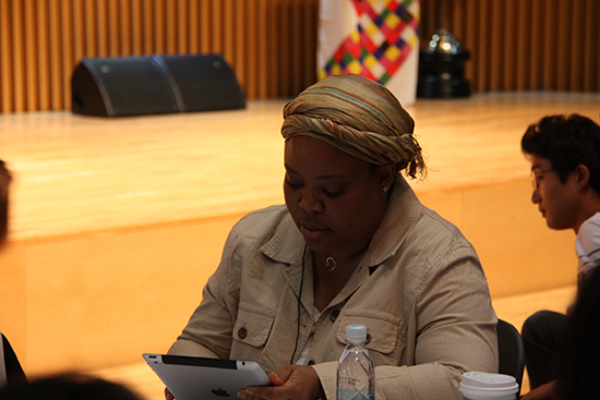 | ▲25일(월) 서울시청 다목적홀에서 열린 ‘2015 국제여성평화회의’에 참석한 라이베리아 출신의 노벨평화상 수상자 리마 보위가 발제하고 있다. ⓒ사진제공= YWCA |