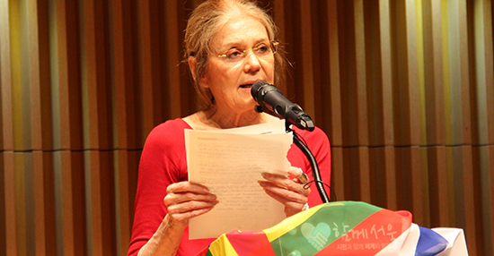 그녀는 이번엔 2008년 보수정권 집권 이후 꽁꽁 얼어붙은 남북관계 개선을 위해 WCD공동명예위원장을 맡으며 직접 평화걷기의 선봉에 섰다. 그녀는 평화걷기 다음 날인 25일(월) 열린 ‘2015국제여성평화회의’에 참석해 기조 발제에 나섰다. 그녀는 발제를 통해 “비무장지대를 통한 여성의 평화걷기는 남북한 통일의 가능성의 상징일 뿐만 아니라, 여성과 남성 사이의, 다른 종교와 다른 경제적 계층 사이의 평화의 가능성을 상징한다”고 밝혔다. 비록 UN사령부의 비협조로 판문점 입국은 무산됐지만, 그녀의 발걸음과 평화에 대한 의지는 남북관계에 의미 있는 이정표로 남게 될 것이다. 아래는 그녀의 발제문 전문이다.