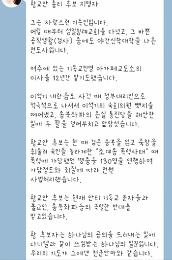 문제의 메시지는 황 후보자가 “자랑스런 기독인,” “어릴 때부터 성일침례교회를 다녔고, 그 바쁜 공직생활(검사) 중에도 야간신학대학을 나온 전도사,” “하나님의 공의를 드러내는 일에 다니엘과 같이 쓰임 받는 하나님의 일꾼”이라고 추켜세우며 “우리의 기도가 그에겐 천군만마와 같다”며 지지를 독려하고 있다.