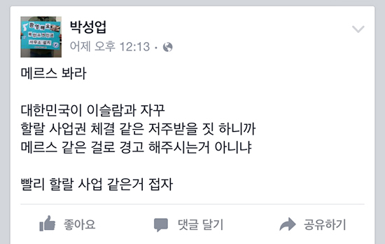 박 씨는 자신의 SNS에 “메르스 봐라. 대한민국이 자꾸 할랄 사업권 체결 같은 저주받을 짓 하니까 메르스 같은 걸로 경고 해주시는 것 아니냐. 빨리 할랄 사업 같은 거 접자”는 글을 올렸다. ‘할랄’은 이슬람법(샤리아)에 따라 먹어도 좋은 음식을 뜻하는 말로, 할랄식품 시장은 2012년 기준 1조 880억 달러 규모로 알려져 우리 식품업계가 비상한 관심을 갖고 있는 수출품목이다. 메르스 환자와 감염자는 사우디와 UAE에 가장 많다. 일반 언론 보도를 종합해 보면 느슨한 방역체계와 낙후된 보건행정이 원인으로 지적된다. 따라서 메르스를 할랄과 연결시킨 박 씨의 주장은 사실과 거리가 멀다. 박 씨의 터무니없는 주장은 처음이 아니다. 박 씨는 지난 해 1월 복음주의권 개신교 단체와 개혁활동가들을 종북간첩으로 매도해 법원에 약식기소 된 바 있다.
