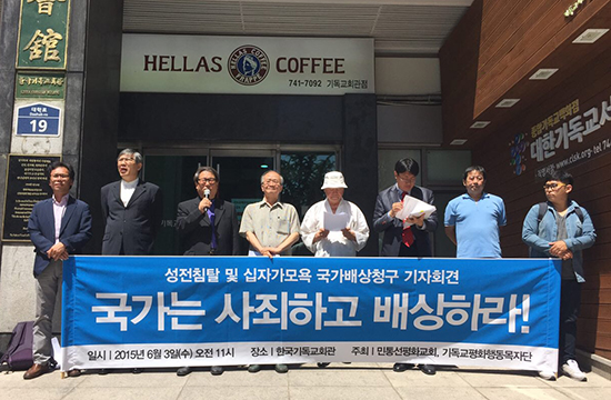 민통선평화교회 이적 목사는 6월3일(수) 오전 종로구 연지동 기독교회관 앞에서 기독교평화행동목자단과 공동으로 “성전침탈 및 십자가 모욕 국가배상청구”를 위한 기자회견을 가졌다.