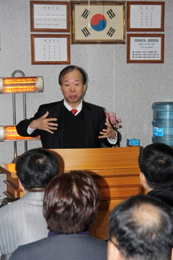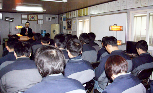 | ▲ 아침 조례를 주재하고 있는 양태열 대표이사. 그는 직원들에게 꿈을 가지라고 독려했다 ⓒ베리타스 |