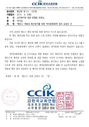 한교연은 이어 이날 보건복지부 문형표 장관 앞으로 공문을 발송해 “퀴어문화축제는 성소수자들을 위한 축제로 국민 대다수의 정서와 부합하지 않고 메르스 확산을 조속히 차단해 줄 것을 바라는 국민적 요구와도 배치되는 행사”라면서 행사 중지 결정을 촉구했다.