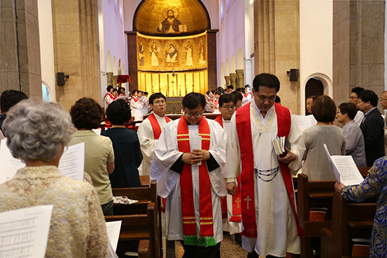6월7일(일) 대한성공회(김근상 주교)는 연중주일로 지키는 가운데 이날 오전 서울 정동 주교좌 성당(주임사제 이경호 신부)에서는 한국기독교장로회 총회 경동교회(담임목사 박종화)와 교환예배가 봉헌됐다. 경동교회는 성령강림 후 3주일로 지키는 점을 감안, 이번 교환예배 전례색은 붉은 색으로 사용했다.