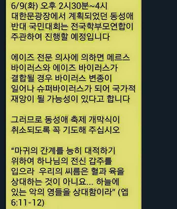문제의 카카오톡 메시지는 “에이즈 전문 의사에 의하면 메르스 바이러스와 에이즈 바이러스가 결합될 경우 바이러스 변종이 일어나 슈퍼 바이러스가 되어 국가적 재앙이 될 가능성이 있다고 한다”며 “동성애 축제 개막식이 취소되도록 꼭 기도해 달라”는 내용을 담고 있었다.