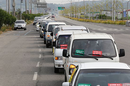 | ▲전북 군산시 미성동·옥구읍·회현면 주민들은 한전의 새만금 송전철탑 건설에 항의해 9일(화) 오후 기장 총회 주최의 시국기도회를 마친 뒤, 차량 20여 대에 나눠 타고 군산시청까지 약 4km 가량 차량 행진을 벌였다. ⓒ사진=지유석 기자 |