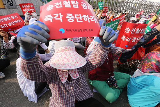 이 지역 주민들은 6월9일(화) 급기야 행동에 나섰다. 주민들은 한국기독교장로회 총회(기장, 총회장 황용대 목사)가 주최한 시국 기도회를 마친 뒤, 차량 20여 대에 나눠 타고 군산시청까지 약 4km 가량 차량 행진을 벌였다. 이어 시청 앞에 집결해 “송전철탑 공사 중단,” “송전선로 변경안 수용” 등의 구호를 외치며 군산시와 한전에 강력히 항의했다.
