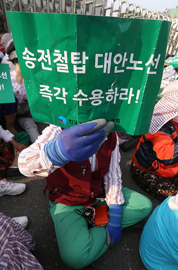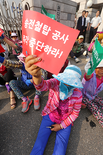 | ▲전북 군산시 미성동·옥구읍·회현면 주민들은 한전의 새만금 송전철탑 건설에 항의해 9일(화) 오후 군산시청 앞에 집결해 시위를 벌였다. 주민들은 “송전철탑 공사 중단,” “송전선로 변경안 수용” 등의 구호를 외치며 군산시와 한전에 강력히 항의했다. ⓒ사진=지유석 기자 |