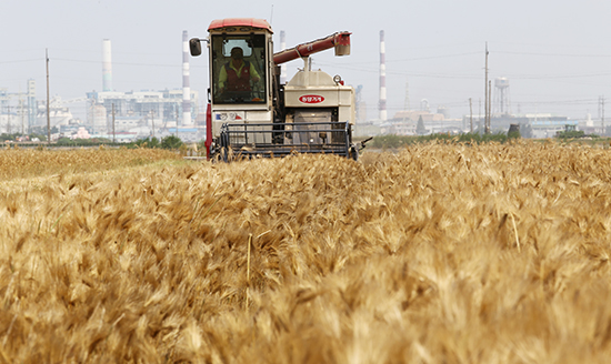 | ▲전라북도 군산의 5월과 6월은 수확과 모심기가 동시에 이뤄지는 계절이다. 콤바인이 부지런히 움직이며 보리를 거둬들이고 있다. 바로 옆 논에서는 모내기를 위한 물가두기가 한창이다. 콤바인 뒤로 군산 산업단지가 보인다. ⓒ사진=지유석 기자 |