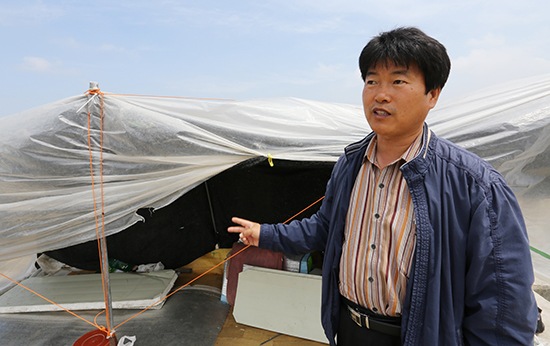 | ▲새만금송전철탑반대공동대책위원회 강경식 법무간사가 주민들이 농성 중인 움막으로 안내하고 있다. 주민들은 움막에서 삼삼오오 모여 한전의 동태를 주시한다. ⓒ사진=지유석 기자 |
