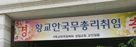 지난 6월18일(목) 국회에서 황교안 국무총리 후보자 임명동의안이 통과되자 황 총리가 협동 전도사로 시무했던 성일 침례교회(담임목사 김정곤)는 21일(일) ‘황교안 국무총리 취임 경축’이라고 적힌 현수막을 내걸었다. 교회 로비는 여러 교회에서 보낸 화환이 가득했고, 이 가운데에는 대전 중문교회 장경동 목사가 보낸 축하화환도 눈에 띠었다. 황 총리는 이날 예배에 참석하기도 했다.