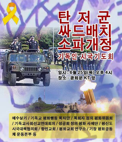 최근 주한미군의 고고도미사일방어체계(사드), 탄저균 반입 등으로 논란이 불거지고 있는 가운데 예수살기, 기독교평화행동목자단, 목회자정의평화위원회, 기독교사회선교연대회의, 성공회 정의평화사제단 등은 오는 6월25일(목) 오후 4시 서울 광화문 KT 앞에서 “탄저균, 사드 배치, 소파(SOFA)개정을 위한 시국기도회”를 연다.
