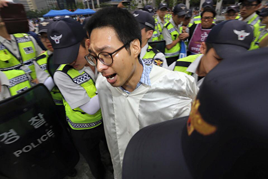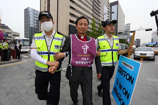 | ▲기독교평화행동목자단 박병권 목사가 연행되고 있다. ⓒ사진=지유석 기자 |