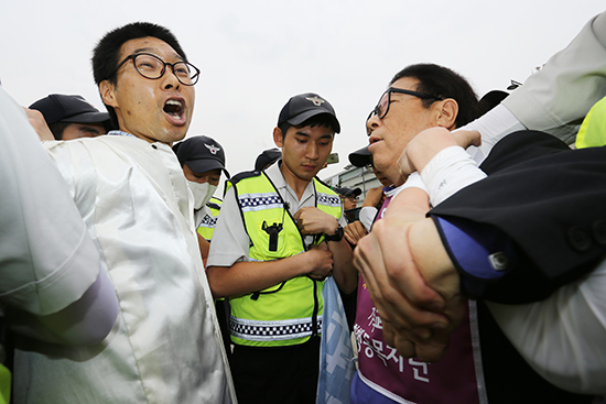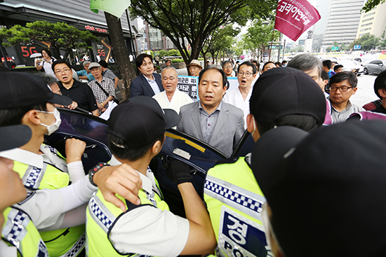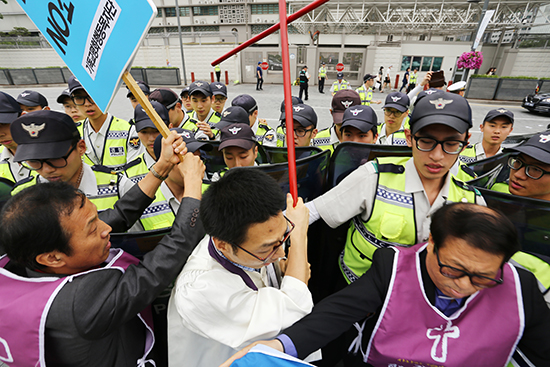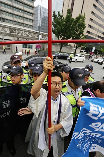 | ▲민통선평화교회 이적 목사, 기독교평화행동목자단 박병권 목사, 민통선평화교회 최민 성도 등이 주한미대사관 진입을 시도하려다 경찰에 의해 막히고 있다. ⓒ사진=지유석 기자 |