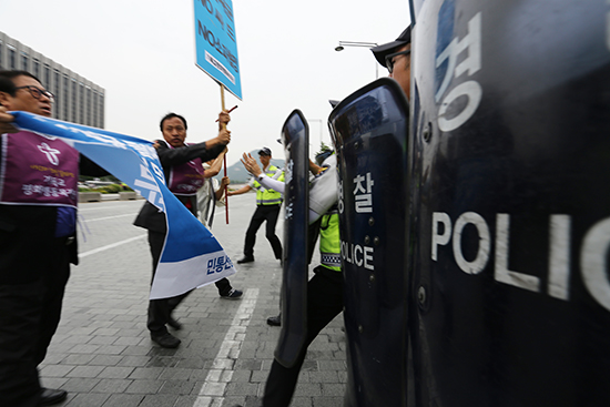 | ▲25일(목) 오후 서울 광화문 주한미대사관 앞에서 열린 시국기도회를 마친 뒤 참가자들은 대사관을 향해 행진했다. 경찰이 이를 저지하자 참가자들은 찬송을 부르며 경찰에 맞섰다. ⓒ사진=지유석 기자 |