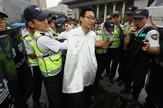 | ▲민통선평화교회 이적 목사, 기독교평화행동목자단 박병권 목사, 민통선평화교회 최민 성도 등이 주한미대사관 진입을 시도하려다 경찰에 의해 체포됐다. ⓒ사진=지유석 기자 |