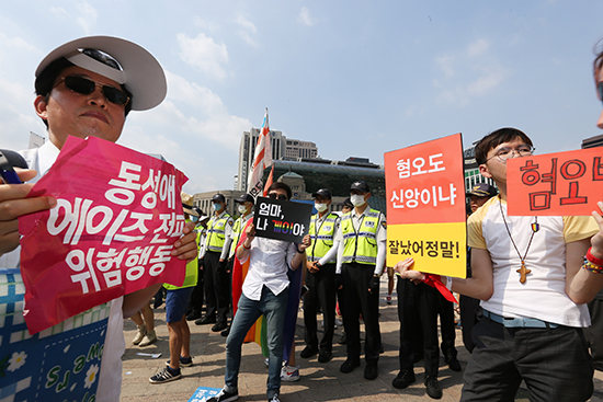 | ▲지난 6월28일(일) 서울광장에서 펼쳐진 퀴어 문화축제에서 한 기독교인이 동성애 반대 격문이 적힌 팻말을 들고 광장 진입을 시도했다. 이에 대해 문화축제 참가자는 기독교계의 동성애 혐오를 규탄하며 맞서고 있다. ⓒ사진=지유석 기자 |