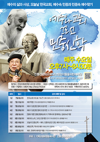 기독교평화행동목자단은 오는 7월8일(수)부터 매주 수요일 오후 서울 종로구 대학로 민통선평화교회 고난예배당에서 “예수와 교회, 그리고 민중신학”을 주제로 민중신학 연속강좌를 개최한다.