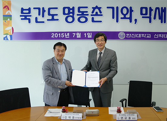 한신대학교(총장 채수일)와 규암김약연기념사업회(회장 윤병석 교수, 이하 사업회)는 7월1일(수) 오후 신학대학원 장공기념관 소회의실에서 ‘북간도 명동촌 막새 기증식’을 열었다.
