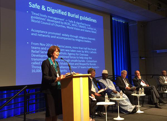 “Ebola & HIV/AIDS” 세션에서 세계교회협의회 건강 및 치료 프로그램 이사인 수 패리 박사는 에볼라와 에이즈에 대한 FBO의 활동에 관해 발표했다. 그녀는 에볼라가 기술적 접근만으로는 신속하고 효과적으로 제어하기 힘들고 생활습관의 변화가 동반되어야만 퇴치할 수 있는 질병의 고전적인 사례라고 지적했다: “에볼라 퇴치에는 공동체의 협조가 필수적이며 이는 신앙지도자들이 우선적으로 인식하고 대처해 왔던 요소이다.”