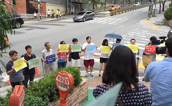 | ▲삼일교회와 관련 시민단체 활동가들은 19일(일) 예장합동 총회 서기인 권재호 목사가 시무하는 서울 금천구 도성교회 앞에서 시위를 벌였다. ⓒ사진제공= 삼일교회 치유와 공의를 위한 TF팀 |