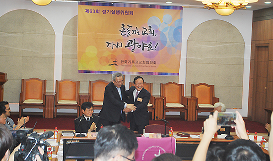 | ▲예장통합 측이 NCCK 활동에 복귀했다. 이는 NCCK가 예장통합 측이 주장하는 제도 개선안을 수용하기로 방침을 정한 데에 따른 결과였다. 예장통합 측 손달익 목사와 황용대 목사(NCCK 회장)이 악수를 하고 있다. ⓒ사진=이인기 기자 |